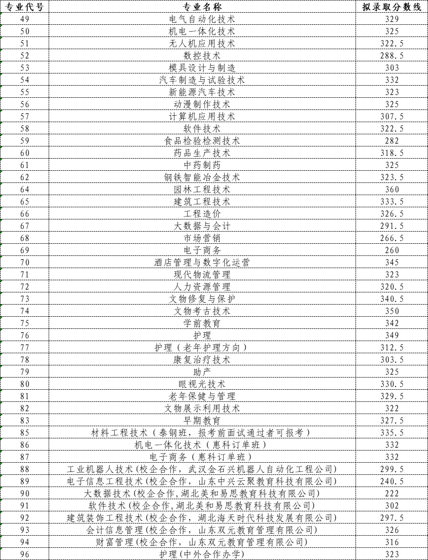 莱芜职业技术学院2022年综合评价招生考试各专业拟最低录取分数