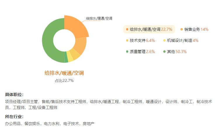 主要面向制冷与空调设备制造行业及其应用领域,在相关产品设计、生产、质量管理、销售和运行管理、售后服务等岗位群,从事设备制造、技术应用、产品销售、产品安装、产品维修等工作。